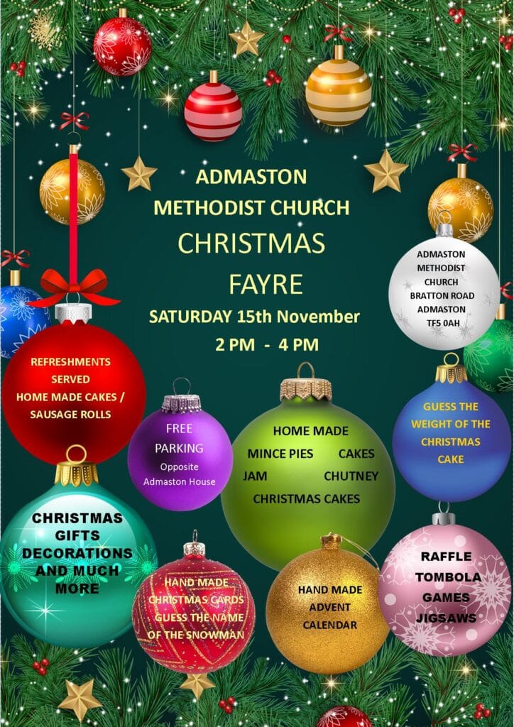 It’s beginning to look a lot like Christmas…So why not come along to the Christmas Fair at Admaston Methodist Church? – Wheelchair accessible